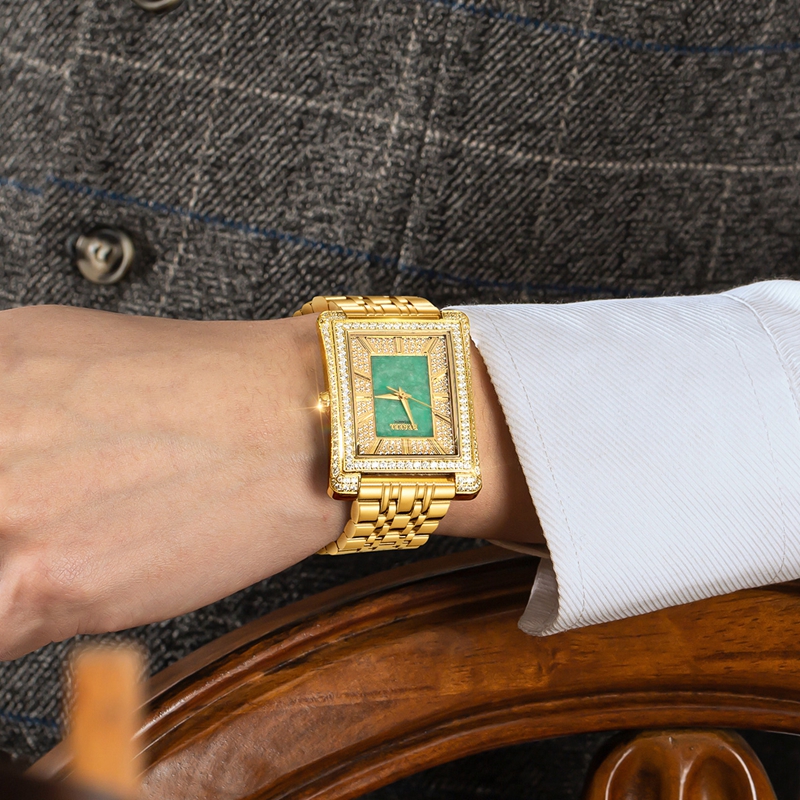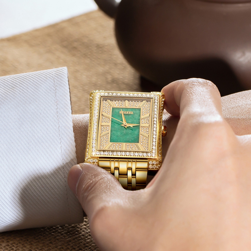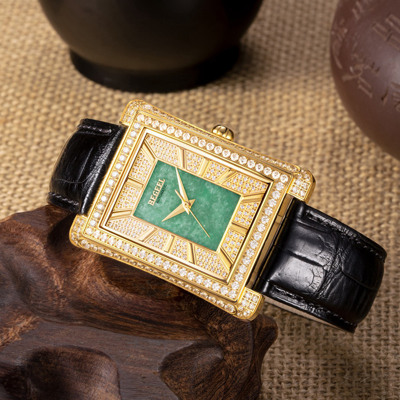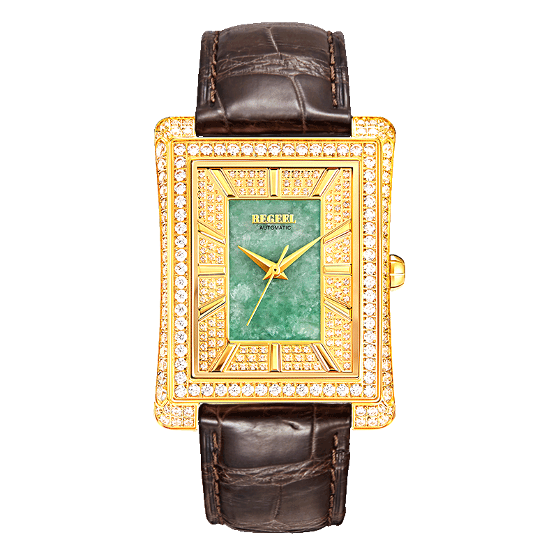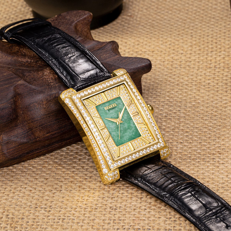 MASTER·大師系列-賓爵設計師從傳統金玉滿堂典故中汲取靈感,將黃金、美玉、晶鉆三種貴重材質相結合,融合現代裝飾主義美學,完美詮釋了奢華的新定義。方形表殼鑲襯剔透晶鉆,方形翡翠玉牌以金鑲玉工藝鑲嵌表盤,閃耀滿天星刻度圈簇擁著方形翡翠玉牌,堆金砌玉,美鉆加持,黃金的高貴、翡翠的瑩綠,晶鉆的閃亮三者相互輝映,閃耀非凡,暗合了腕表“金玉滿堂”的美好含義。金玉其外,金玉其內,既擁有雄厚的財力,又擁有豐富的才學。