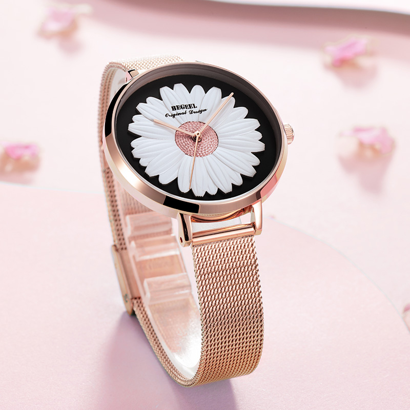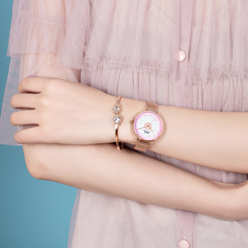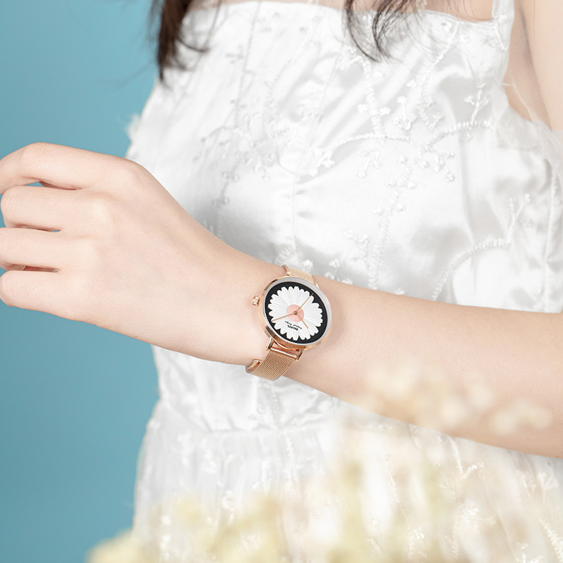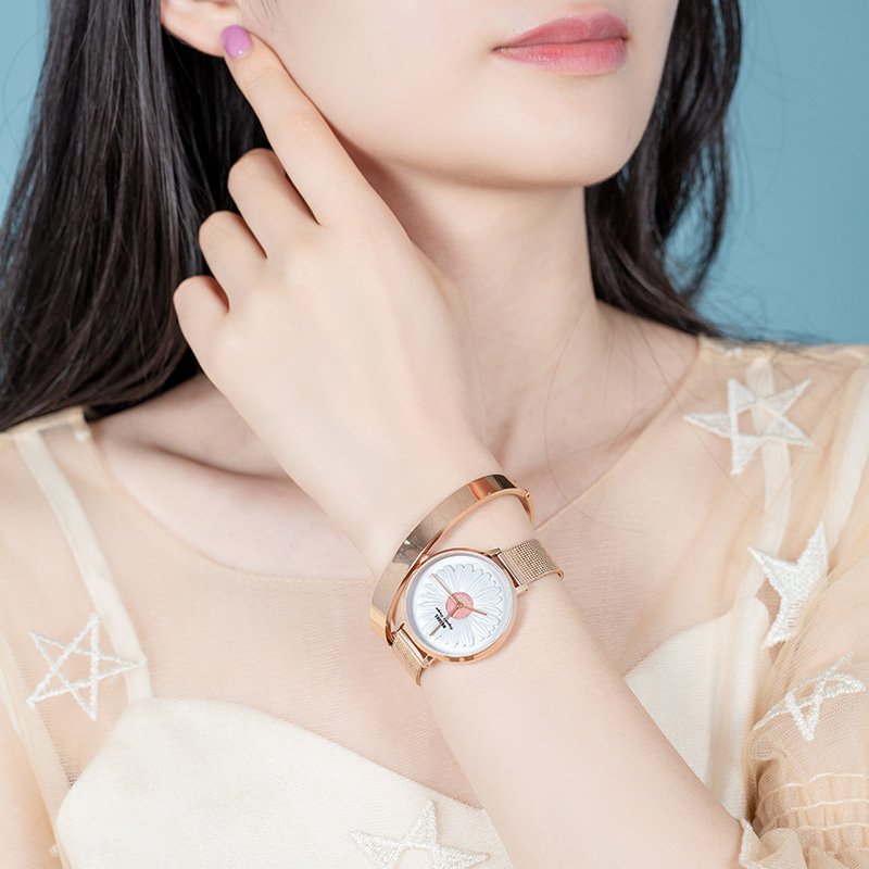 以大自然元素,設計出妙趣橫生的清新少女風腕表。白色的雛菊花瓣微微含露,立體而有質感,像少女的悸動含羞。清新浪漫雛菊立體表盤,素顏的配色的3D花朵宛如腕上花園,多一分俏皮。妙趣橫生的自然之美,讓人一見鐘情。淡雅的顏色和留白、粉色、黑色設計,展現出了田園風和淑女式的優雅。