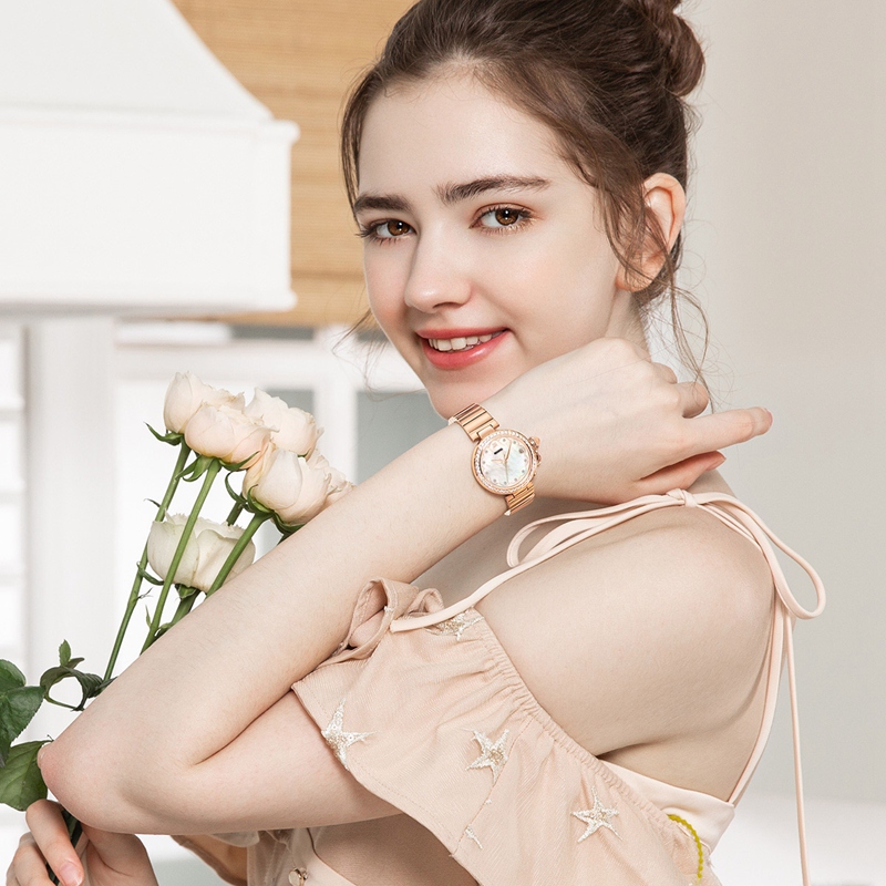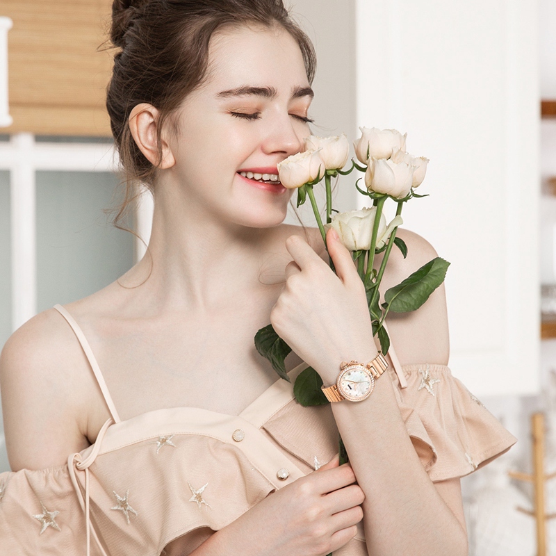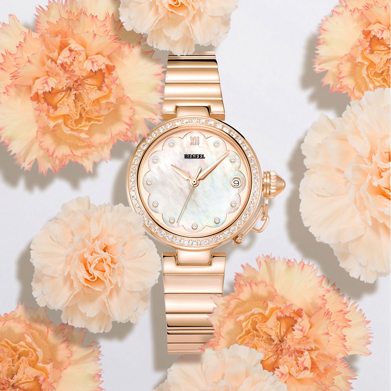 本款的字面設計取自“花朵盛開在太陽初升時”的場景,外部一圈形似花瓣的輪廓,以珍珠母貝為底,幻彩的貝面反射光線,就像一朵盛開的嬌艷鮮花在朝陽初升的迷朦霧氣中,若隱若現;10顆水鉆作為時間刻度顯示,就像花瓣上晶瑩的露珠,折射出耀眼的光澤。旭日東升,花開幾朵,象征著一天美好的生活