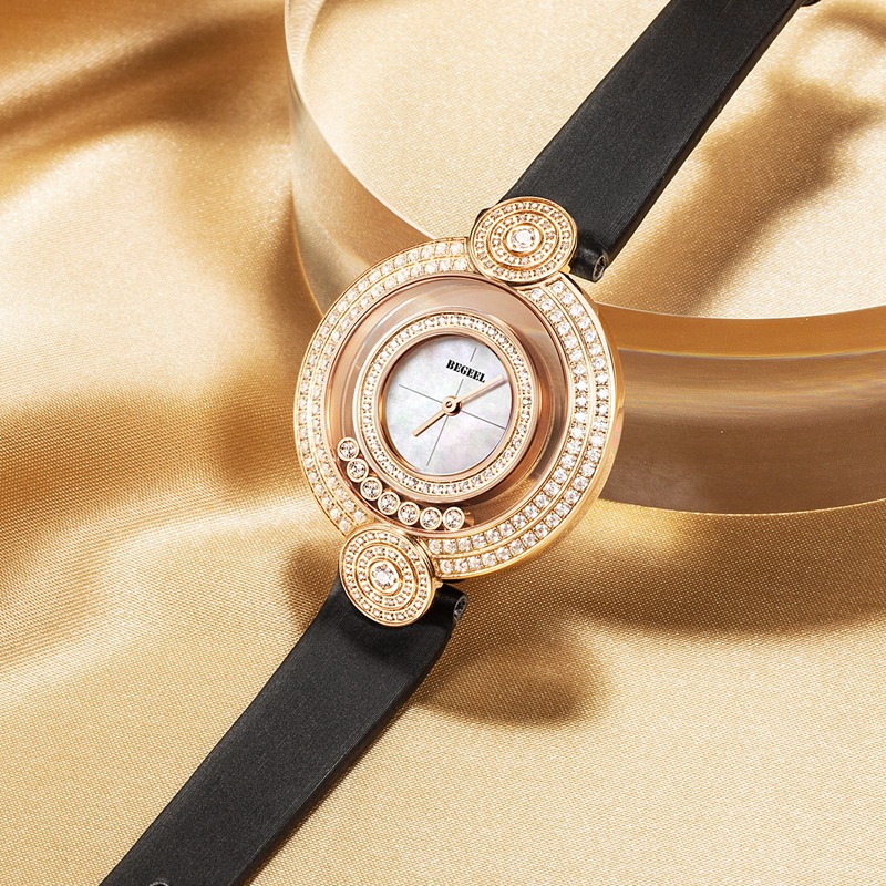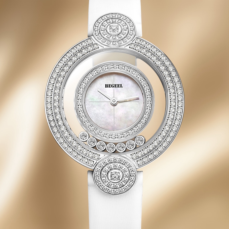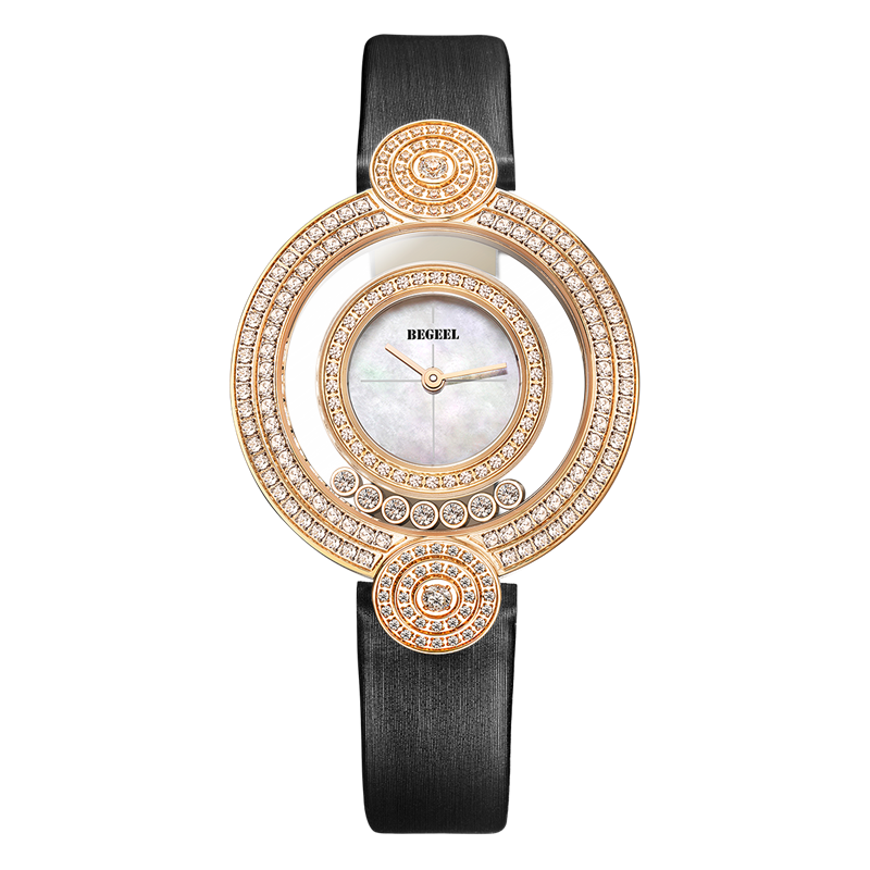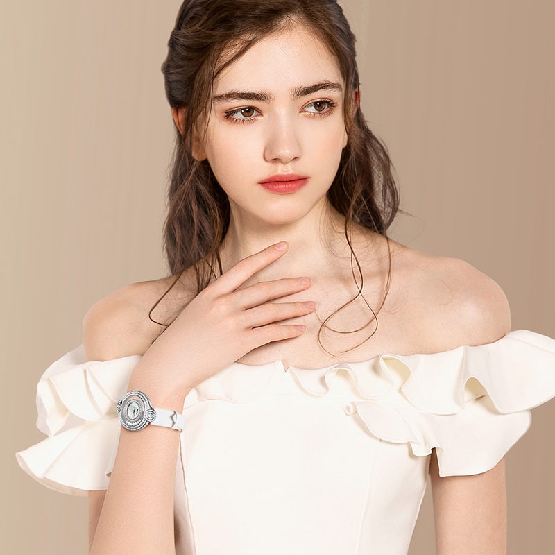 以簡約的線條展示清麗典雅的設計風格,象征繆斯女神的自信與光芒。表盤采用了特有的“鏤空”設計,較小的同心圓為珍珠母貝質地,呈圓滿的球型。兩個同心圓環皆為拋光打造。 兩個圓環之間、藍寶石水晶鏡面的無形護佑下,七顆靈動水晶鉆如懸空漂浮一般,在流光溢彩的閃爍光華中無盡地回旋、轉動。表殼的頂端與底端各綴有一粒單顆水晶鉆,使表殼到豐盈的黑、白色表帶之間的過渡呈現出簡潔、雋永的顯著風格。