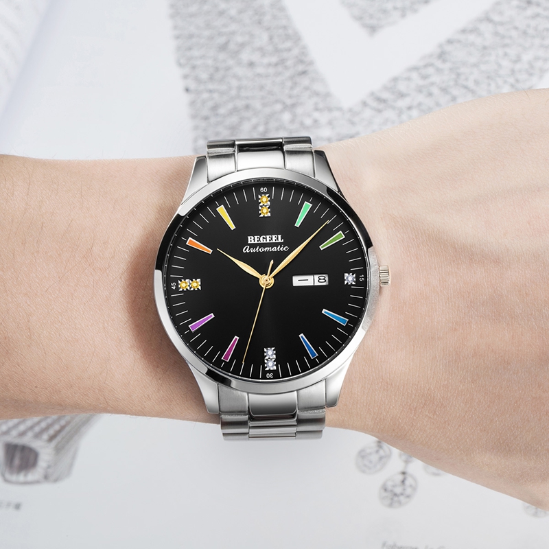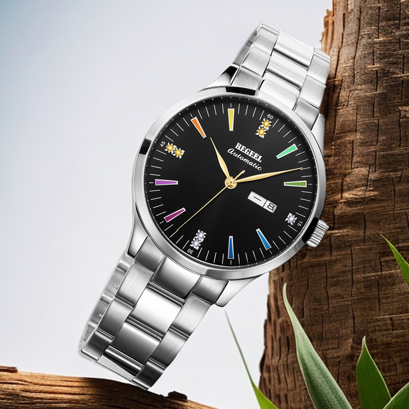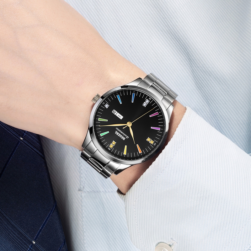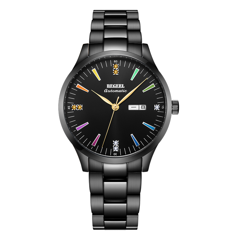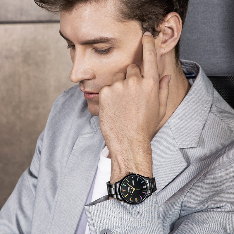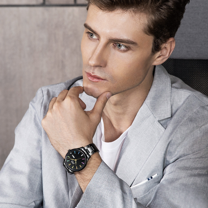 光透過三棱鏡的折射產生了繽紛光亮,宛若七色彩虹,設計師從中汲取靈感作為裝飾:彩色合成寶石與漸變條釘相互映襯,打造出如夢似幻的絢爛效果,頗具運動風的外型詮釋瀟灑型男的獨特選擇,時髦商務兩不誤。