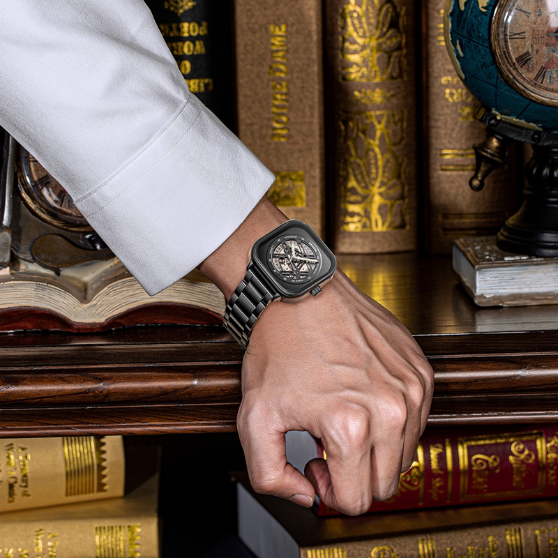 以暗夜中急行軍令的武士為設(shè)計靈感,將黑夜的神秘未知與精致鏤空的機械設(shè)計融為一體,盤根交錯的鏤空結(jié)構(gòu)勾勒出鐵甲武士的行動軌跡,在以外方內(nèi)圓的別致設(shè)計,在沿襲傳統(tǒng)工藝美學(xué)的同時,大膽呈現(xiàn)品牌別具一格的不凡品味。雙面鏤空與全景背透,和您一起揭開武士的神秘面紗。