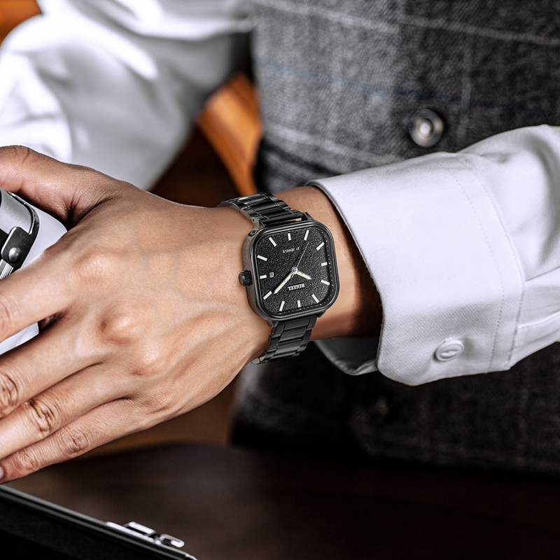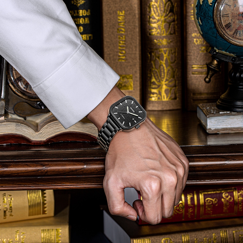 UNIVERSAL·寰宇系列-以茂密的叢林為設計靈感,將硬朗的方形表盤設計融入時計之中,并以暗黑質感的磨砂面勾勒出密林的神秘與險峻,幽暗森林,險象環生,可有一群人不畏險阻,旨在打破未知的迷茫,尋求其背后的真實。這款暗黑森林腕表也象征著賓爵腕表對探索者致以的崇高敬意。