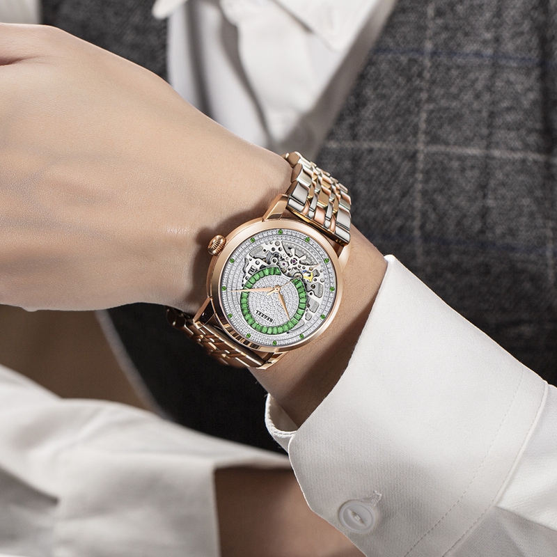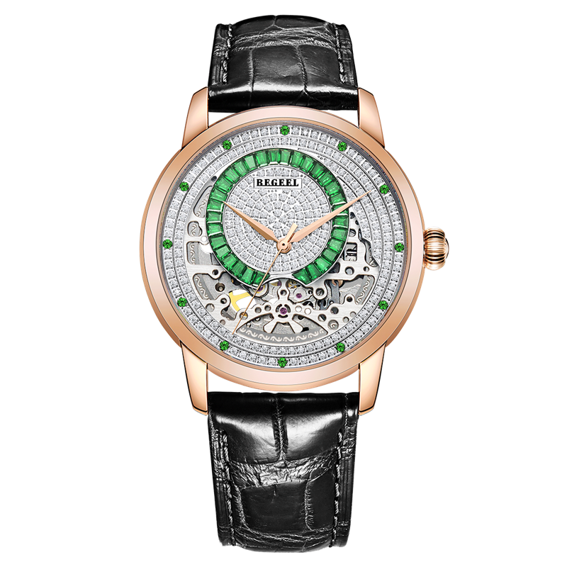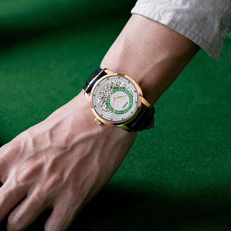 LEGEND·傳奇系列-見證者—腕表設計靈感來源于上海浦東世紀大道《東方之光》(日晷針)造型,它是以古代計時用日晷為原形,用不銹鋼管構成錯綜精致的網架結構,使這座垂直高度達20m的金屬雕塑,顯得既雄偉大氣,又通透靈秀;日晷令人聯想到遙遠的歷史,旨在突出時間紀念的主題,設計師參考東方之光的造型,結合沙弗萊石等稀有原料,糅合到腕表的表盤設計之中,彰顯男士的尊貴風范。