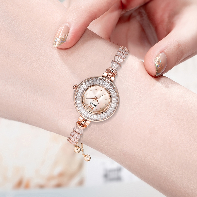 精選珍珠母貝經拋光工藝處理,散發著珍珠般柔和的色澤,呈現精潤細膩的質感。小扇子造型帶來珠寶的貴氣感,搭配可調節滾動表扣,實現了手鏈與腕表的結合,既是腕表,更是珠寶。
