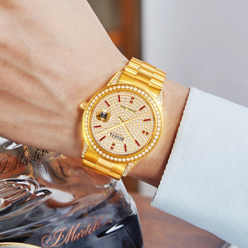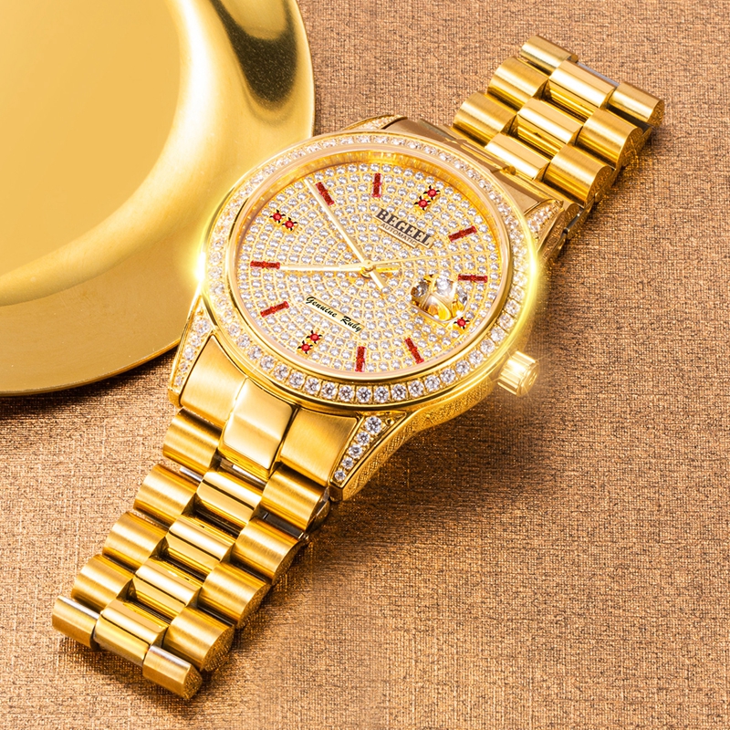 表殼:316L精鋼+電鍍真金 (圈口鑲55顆晶鉆,耳位鑲20顆晶鉆)