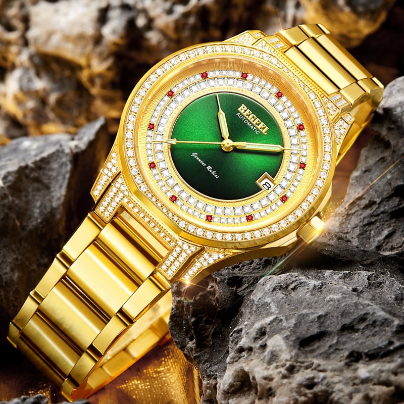 字面:雙紋理,金色流沙紋和綠色太陽(yáng)紋,鑲約105顆方晶鉆,12顆真紅寶石 約0.012ct, 強(qiáng)夜光針