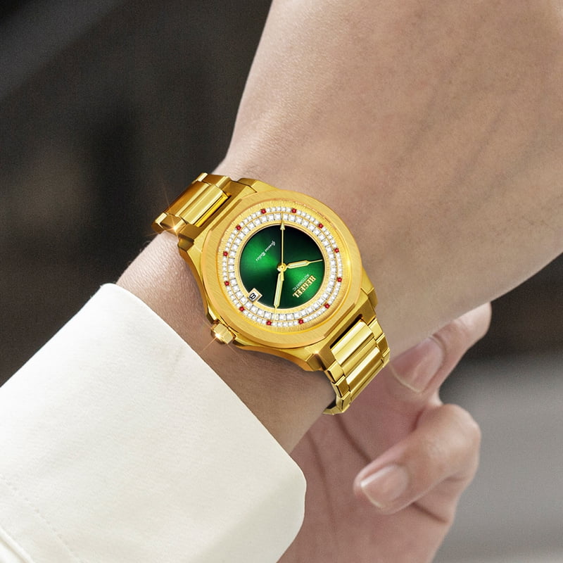 字面:雙紋理,金色流沙紋和綠色太陽紋,鑲約105顆方晶鉆,12顆真紅寶石 約0.012ct, 強(qiáng)夜光針