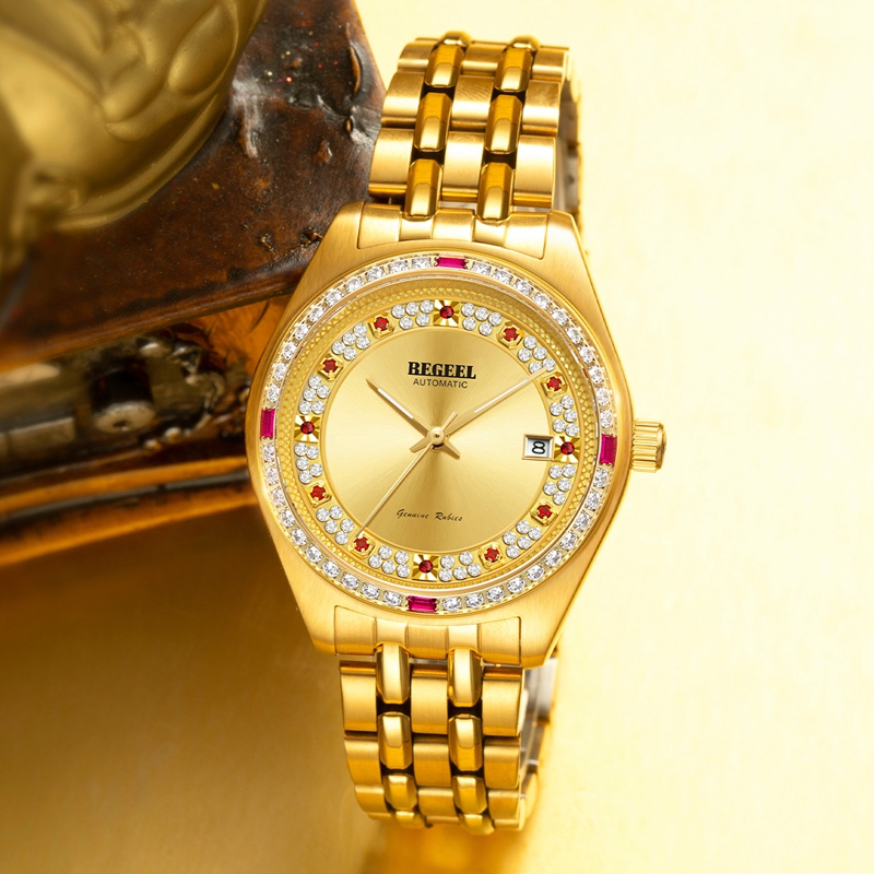 表殼:316L精鋼+電鍍真金,圈口鑲嵌46顆晶鉆