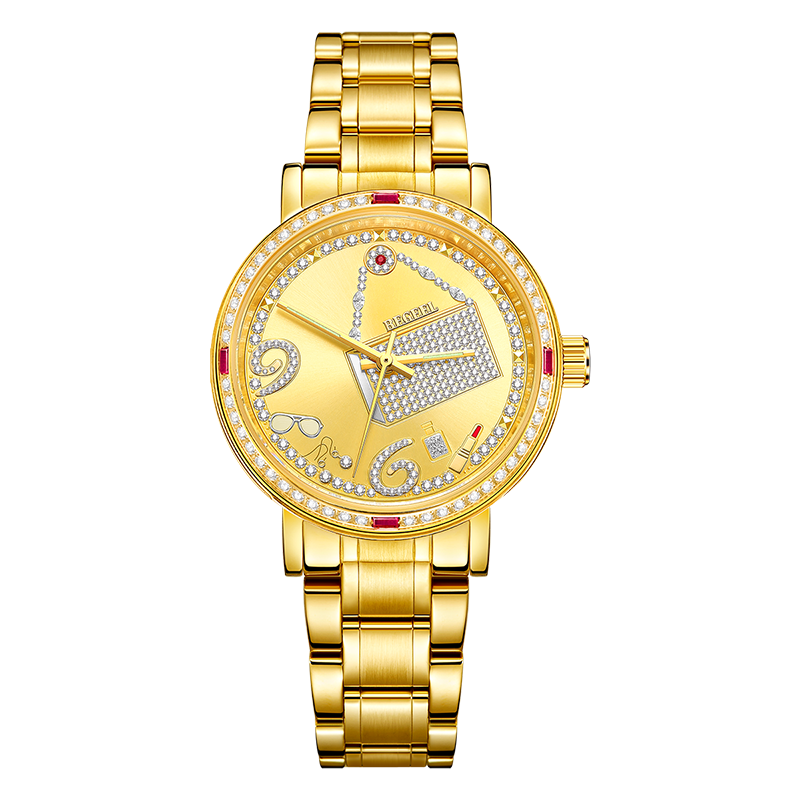 表殼:316L精鋼+電鍍真玫瑰金,圈口鑲54顆晶鉆