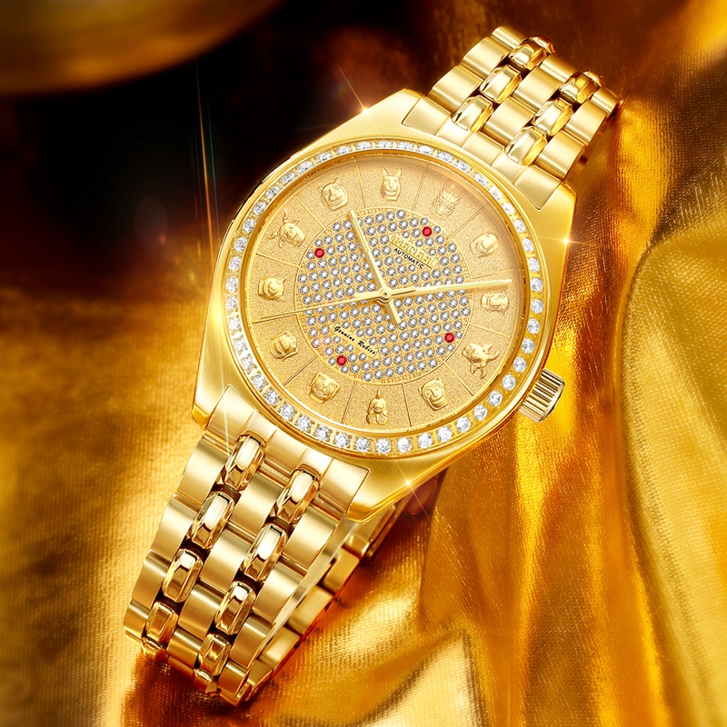 字面:鑲4顆真紅寶石,磨砂金面,刻度位雕刻12生肖電鍍真金,夜光指針,鑲約173顆晶鉆