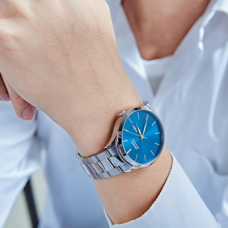 靈感源自現(xiàn)代的藍色光盤和黑膠光碟,設(shè)計師將光碟的圓形結(jié)構(gòu)、經(jīng)典顏色和炫光視覺效果融入表盤設(shè)計,簡約而不失時尚感,為腕表平添了一份趣味。