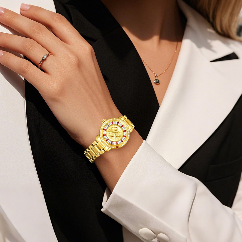表殼:316L精鋼電鍍金,鑲57顆晶鉆,1顆Big合成紅寶石