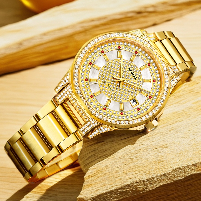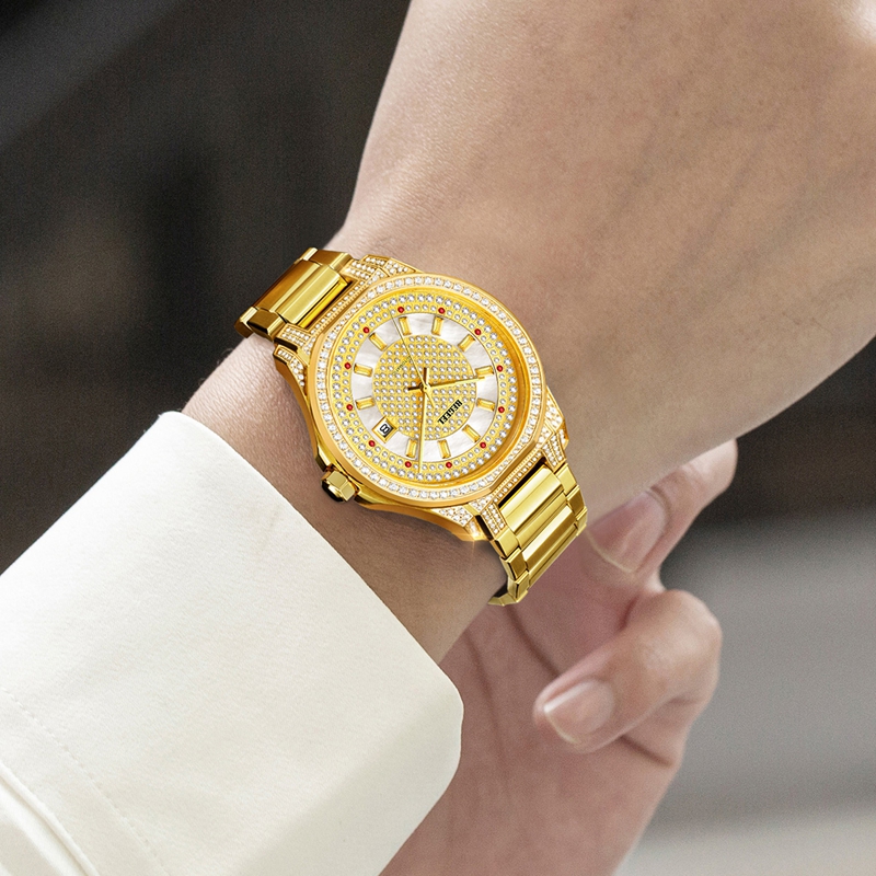 表殼:316L精鋼電鍍真金,鑲約114顆晶鉆