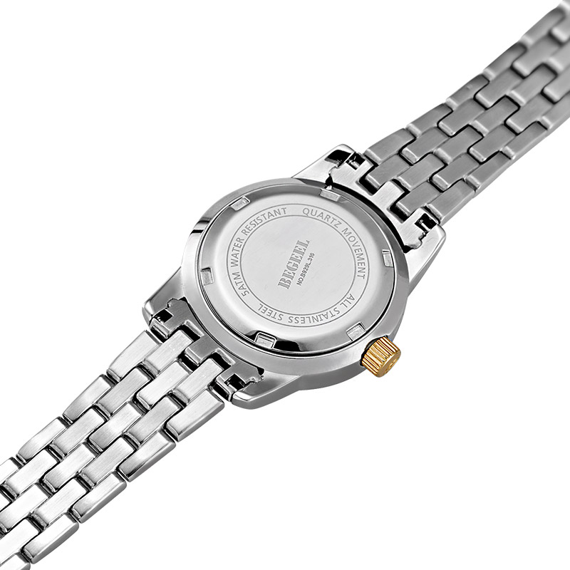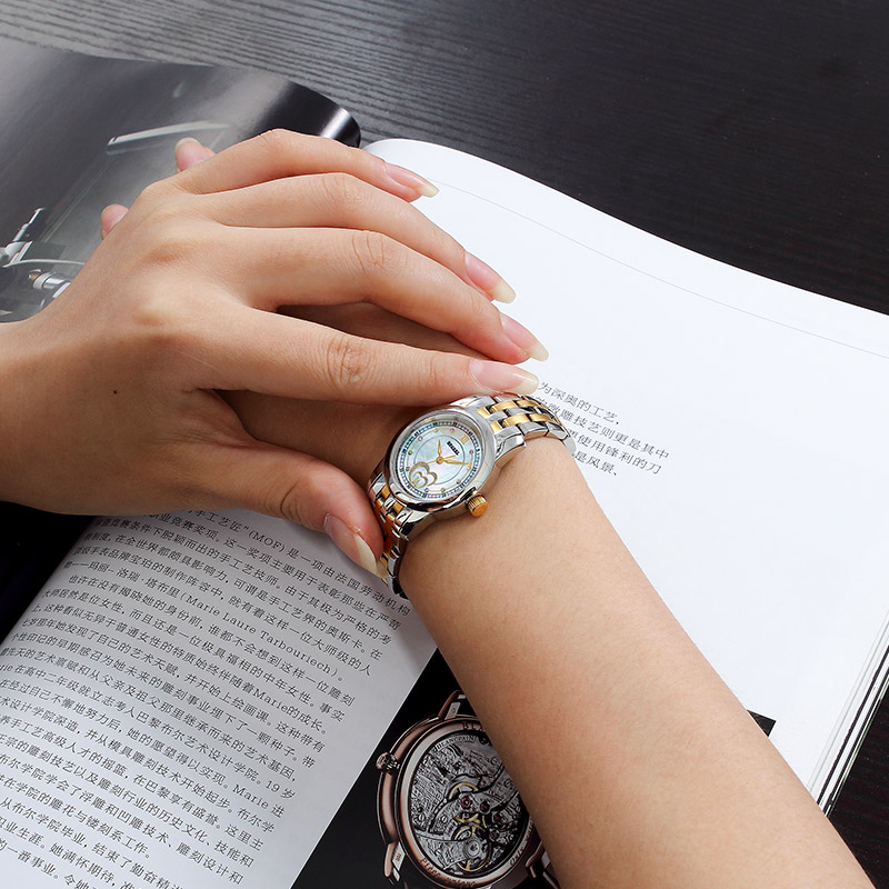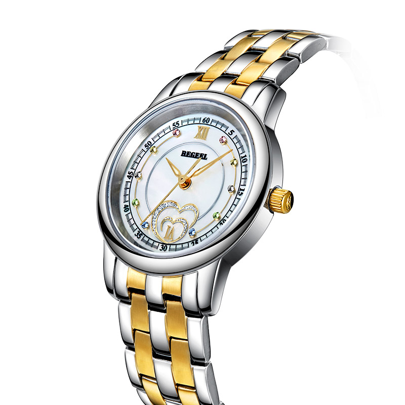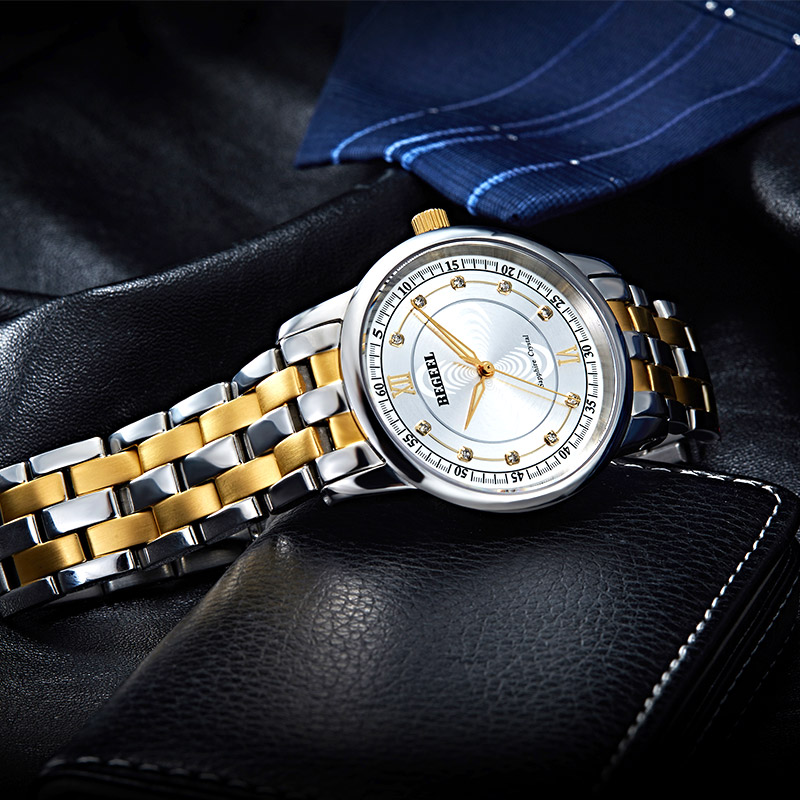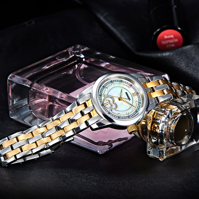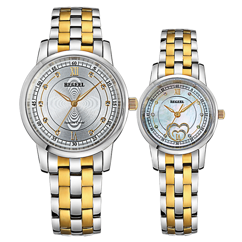 設計理念源自一首情詩“身無彩鳳雙飛翼,心有靈犀一點通”,男女表表盤上均雕刻一對閃耀的金色弧線,仿佛那雙飛的比翼鳥,張開翅膀飛向碧藍的天空而劃開兩道美麗的弧線,金色弧線上分別綴鑲5顆閃亮晶鉆,合計十顆,它印刻愛情的初始,它閃耀愛情的永恒。男表表盤中心鐫刻四道弧形聲波從中心向外擴散,取自超聲波的圖形,寓意著心底的愛意化作聲波傳遞到你心底;女表6點位兩個心形相互串聯,寓意著情人間兩顆漸漸靠近的心,兩心相惜,兩心相知,直至心有靈犀。賓爵臻愛心聲石英情侶表,擷取愛情中最浪漫的元素,鐫刻表盤,愿天下有情人終成眷屬,在時光中見證愛的永恒。