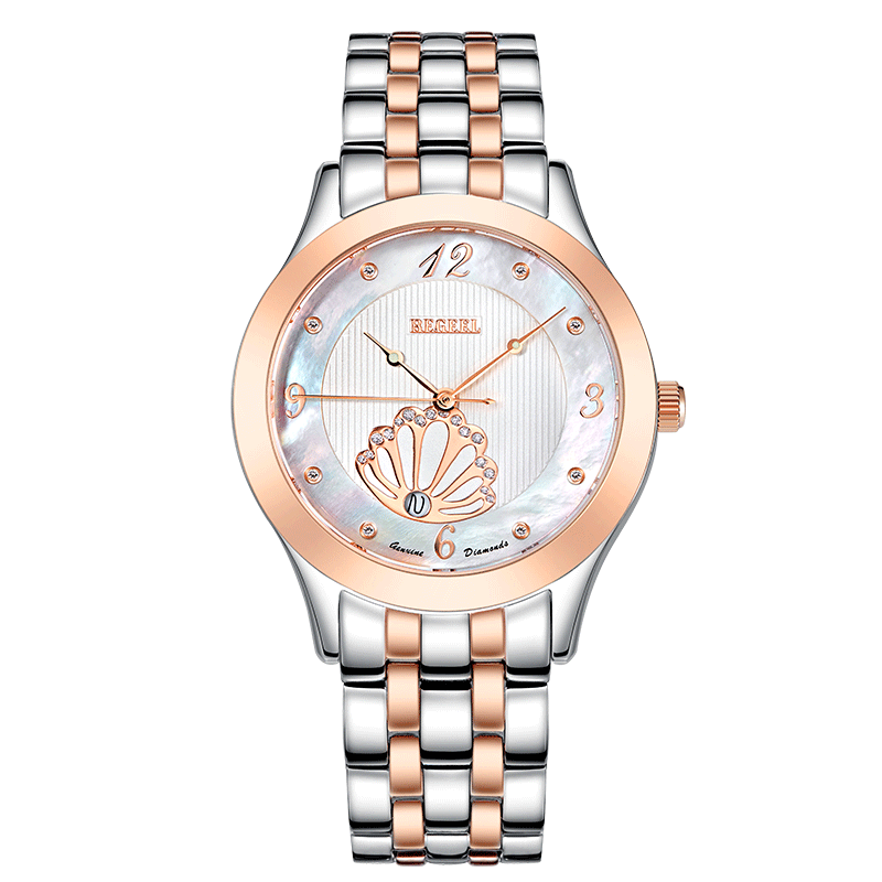 設計師以貝殼和珍珠為靈感來源,融合現代時尚風格,設計出這款婉約優雅的精品女表。珍珠母貝表盤左下方的玫瑰金扇面設計靈感源自白色扇貝的優雅外形;扇面邊緣鑲嵌的14顆明亮水鉆,晶瑩剔透,勾勒出扇貝的美妙曲線,將女性的靈動魅力詮釋得淋漓盡致。